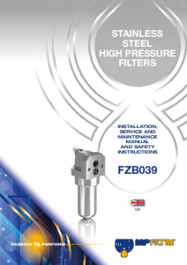 Manifold side mounting stainless steel pressure filter. Working pressure up to 4640 psi (320 bar), flow rates up to 20 gpm (75 l/min).