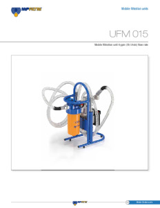 The UFM015 is a light and compact mobile transfer and filtration unit. It uses ELIXIR® RFEX 160 filters series. Flow rate 15 l/min. Max working pressure 4bar. Single-phase electric motor.